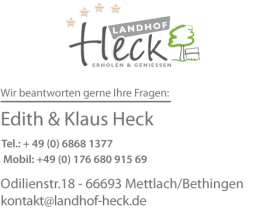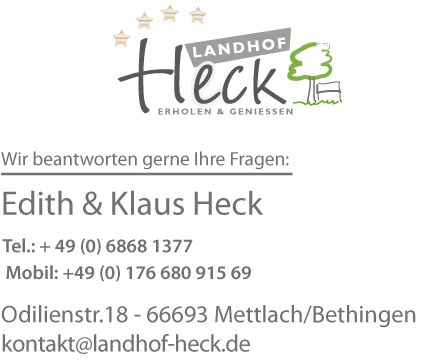 Haben Sie dem Landhof Heck personenbezogene Daten durch eine Buchung oder durch eine elektronische Kontaktaufnahme (E-Mail oder Kontaktformular) freiwillig zur Verfügung gestellt, werden nur die von Ihnen mitgeteilten Daten erhoben, diese Daten nur zur Beantwortung Ihrer Anfragen, bzw. zwecks Durchführung Ihrer Buchung verwendet und an Dritte nur weitergegeben oder sonst übermittelt, wenn hierzu eine gesetzliche Verpflichtung besteht, dies zur Durchführung unseres Angebotes erforderlich ist oder Sie zuvor eingewilligt haben.